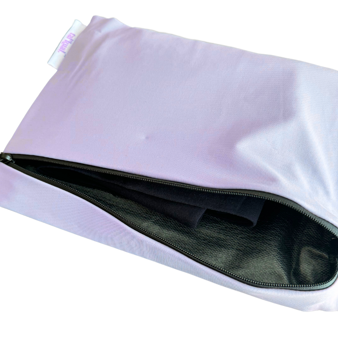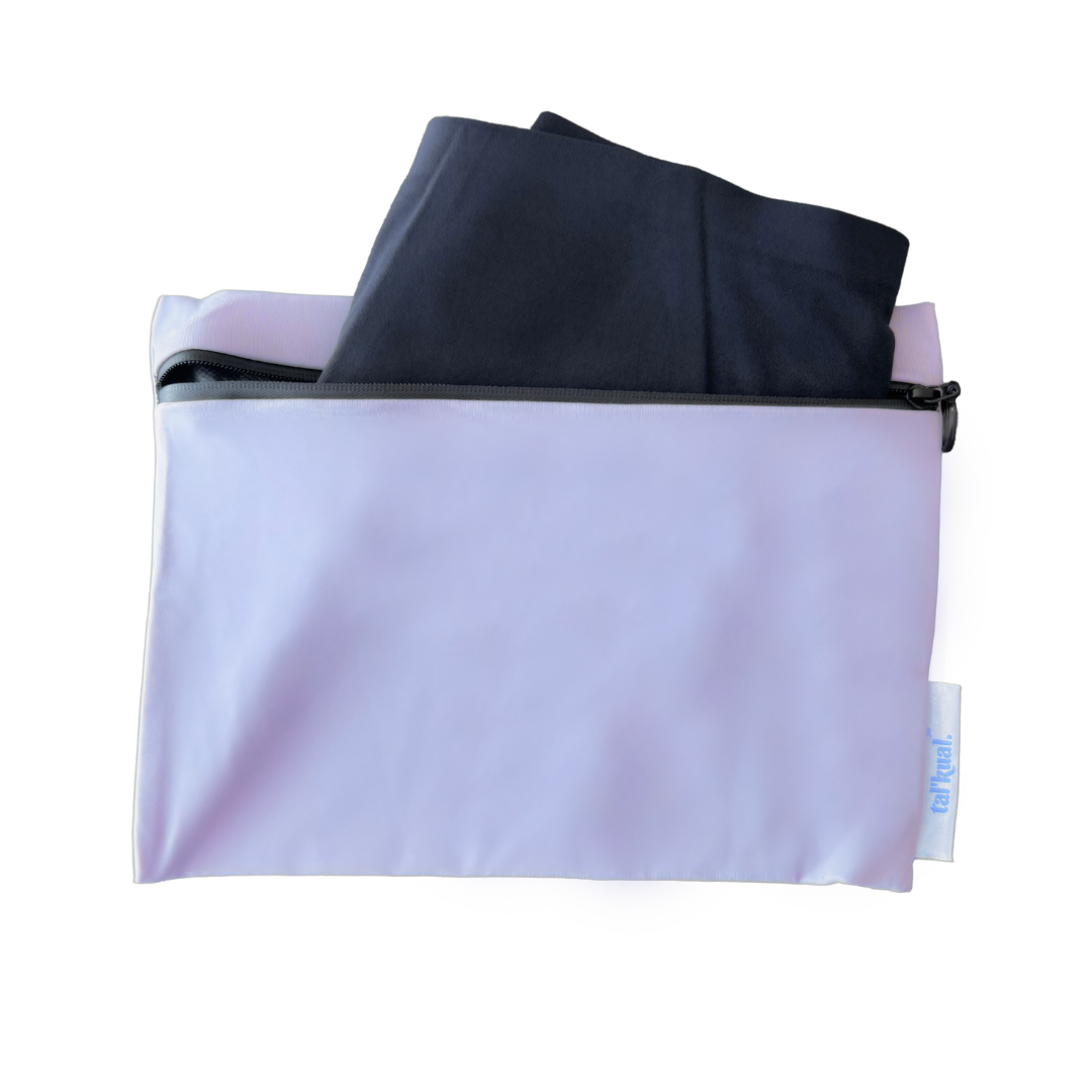 Bolsita transportadora impermeable color morado tal'kual, para hacer más fácil tu cambio de calzón menstrual. Ideal para llevar en tu bolsa o cargar con tus calzones menstruales tal'kual favoritos y #DejarloFluir donde sea.