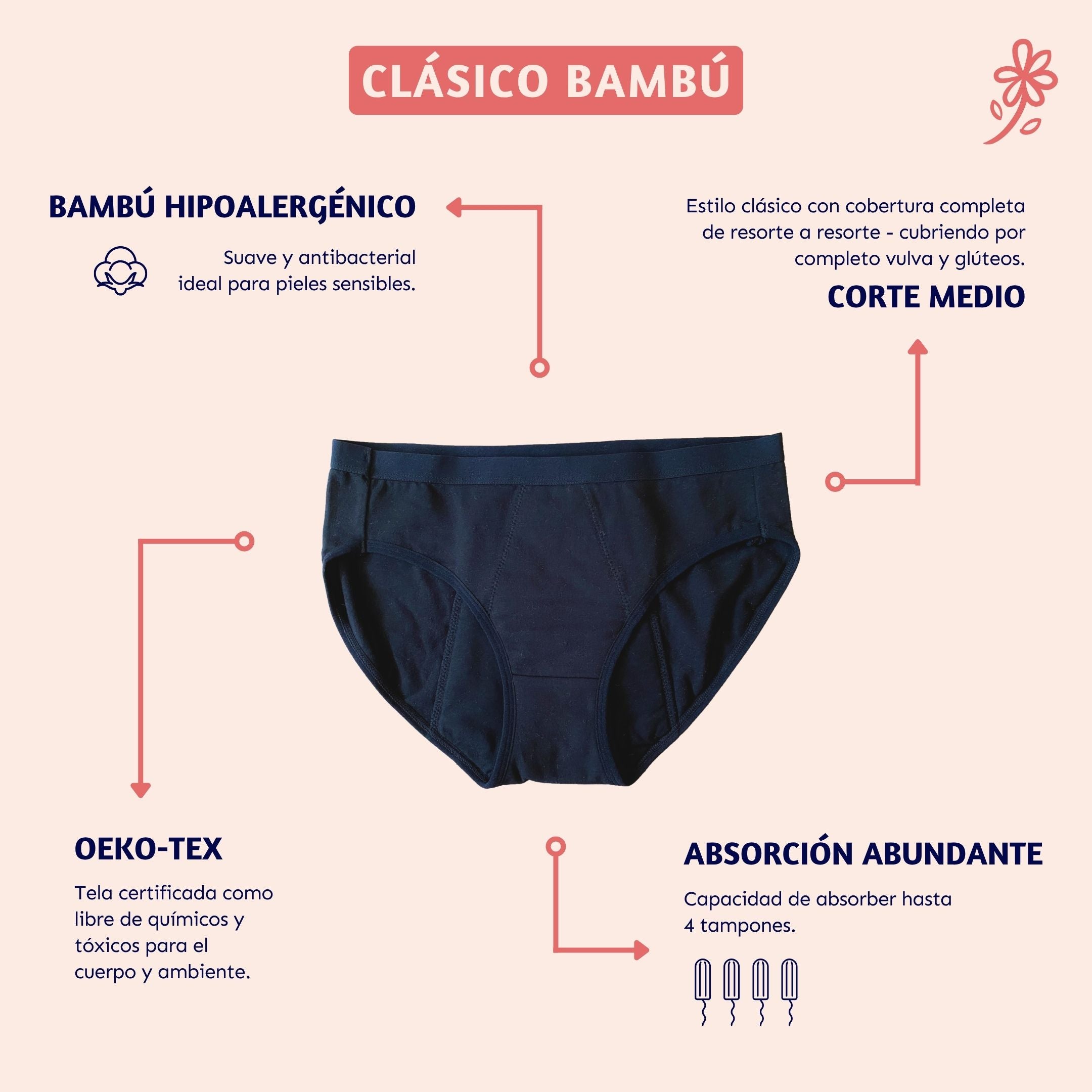 Ropa interior menstrual estilo clásico con tela de bambú con absorción abundante (4 tampones). El modelo que se siente como cualquier otro calzón, con tela extrasuave, hipoalergénica y antibacterial.