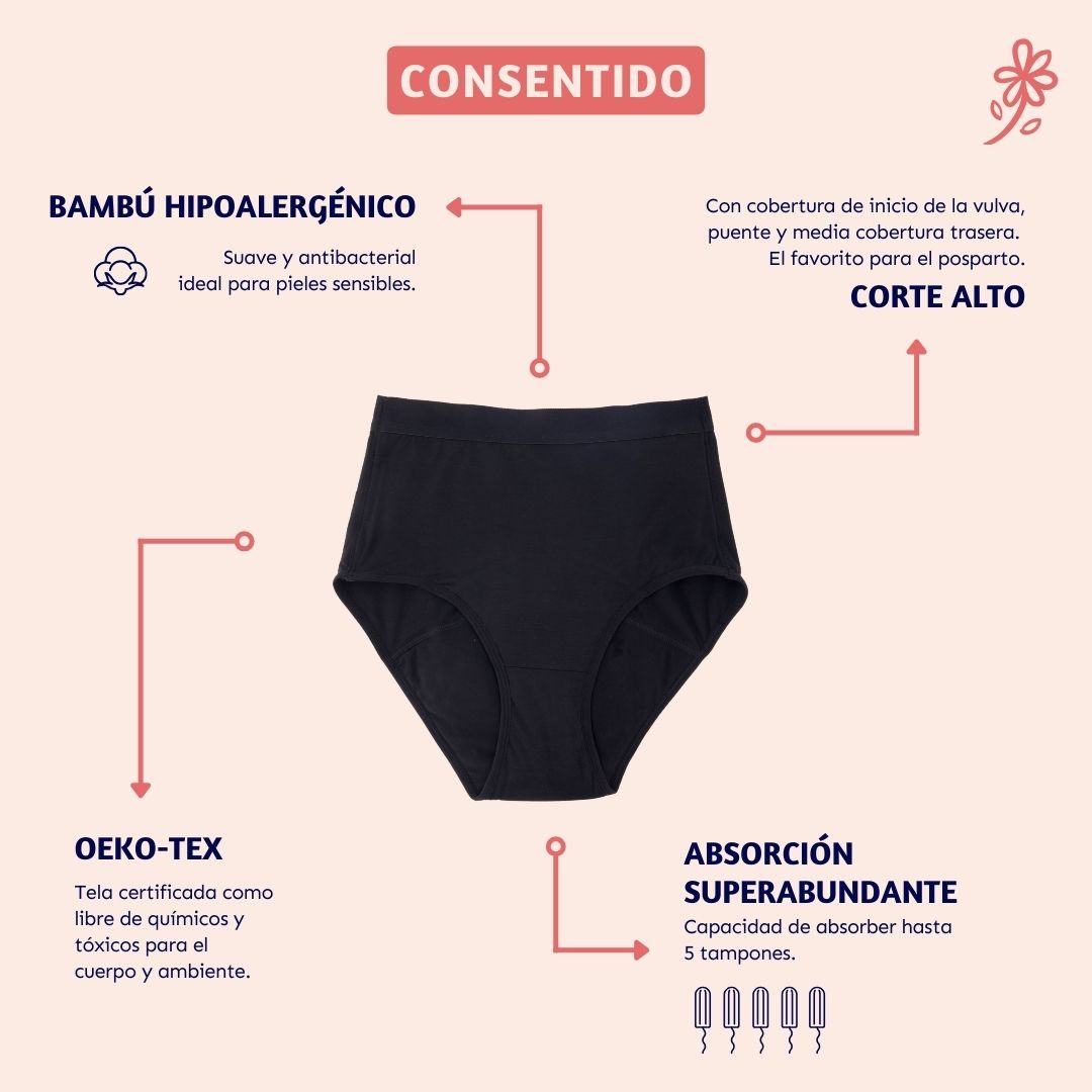 El calzón menstrual que te consiente por su corte alto que da soporte, tela extrasuave de bambú y protección de flujo abundante (con 5 tampones). ¿Por qué el consentido? Reunimos todas las características especiales que hacen que te consientas a ti misma durante tu menstruación y que harán que este calzón, sea tu consentido 💜.