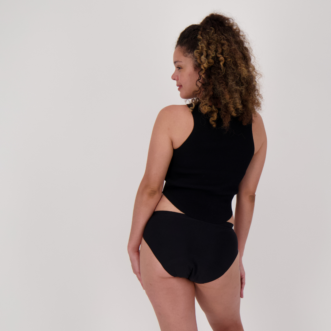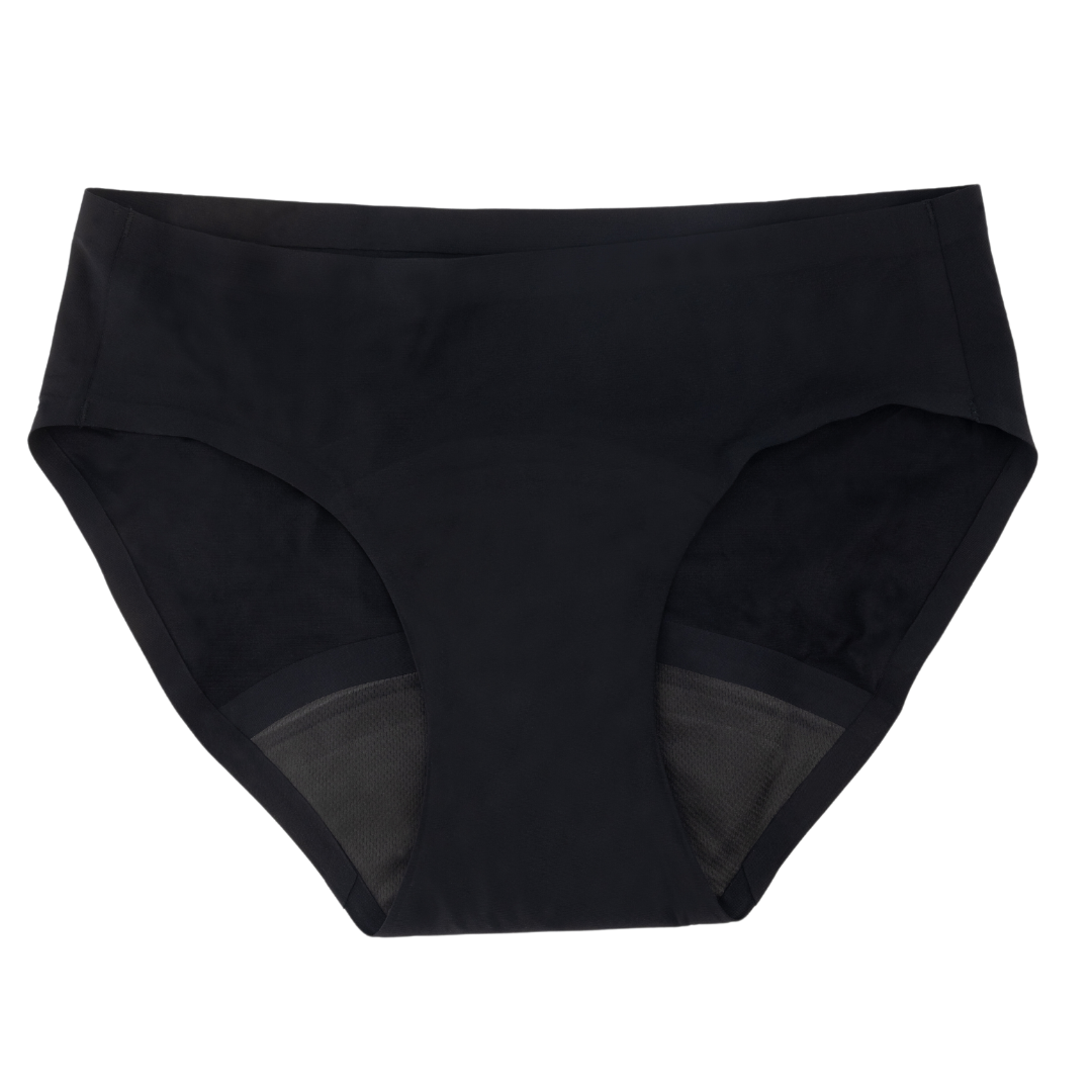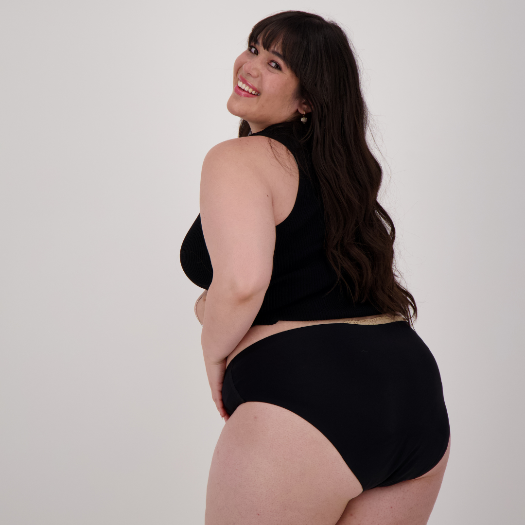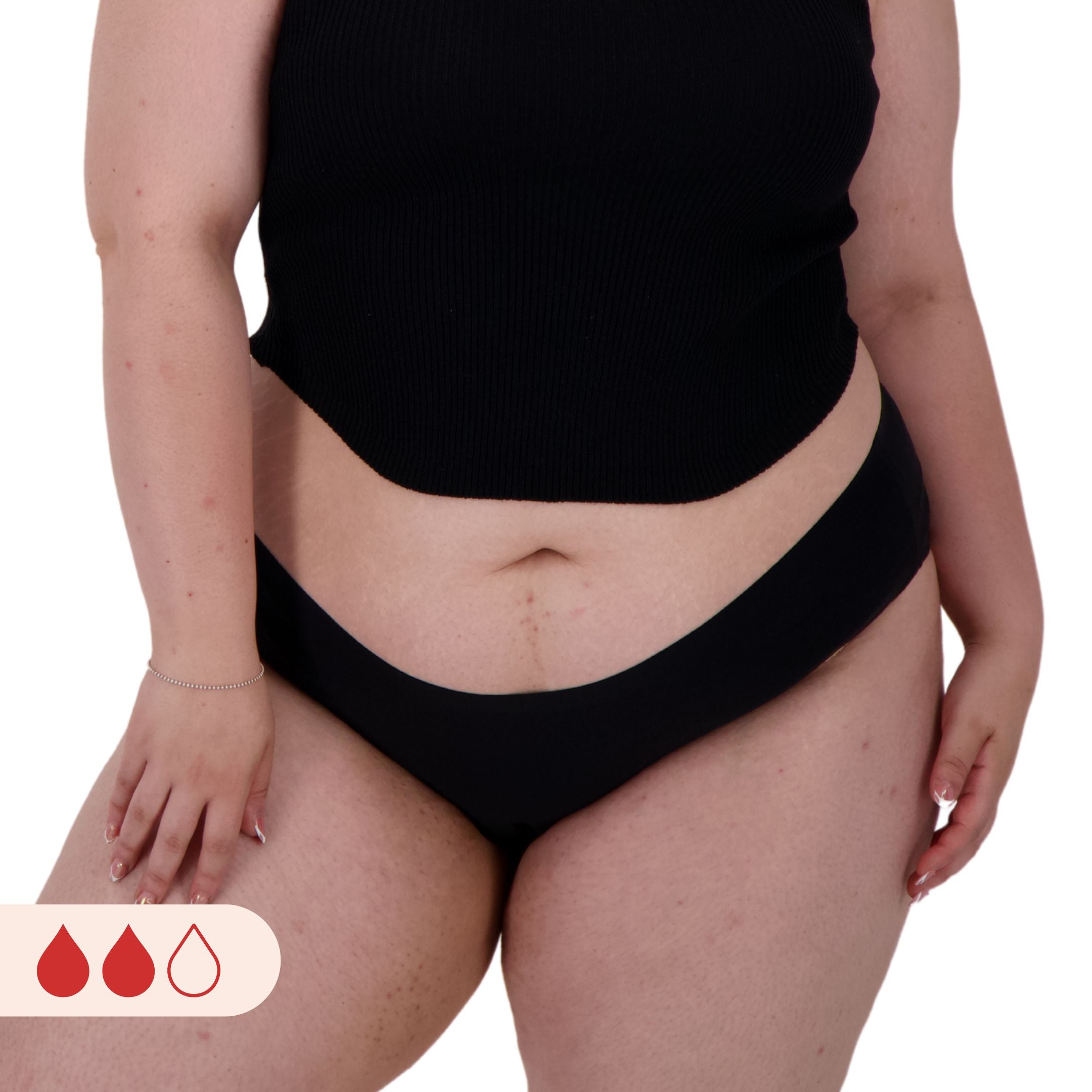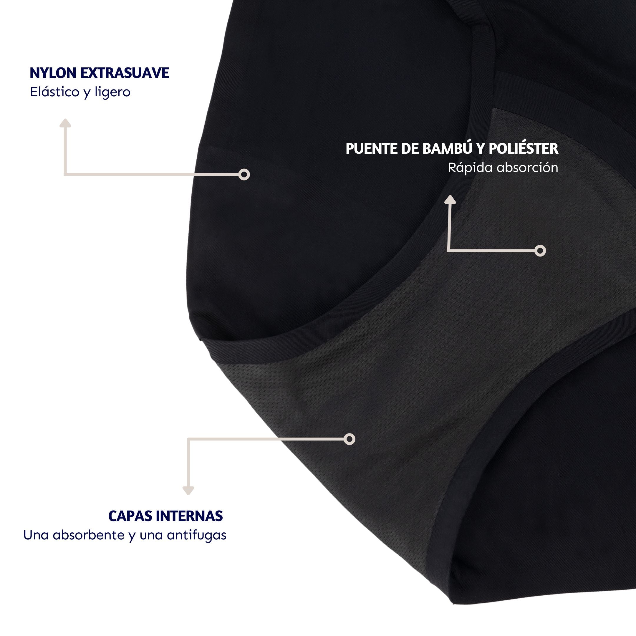 Ropa interior menstrual absorbente estilo bikini con corte invisible y absorción moderada. Con tecnología antifugas en los bordes, que te dará la máxima seguridad. Su tela extraligera estilo seda y terminación sin costuras lo hace ideal para usar con cualquier tipo de ropa. Es el más elástico, por lo que no aprieta y se adapta al cuerpo.