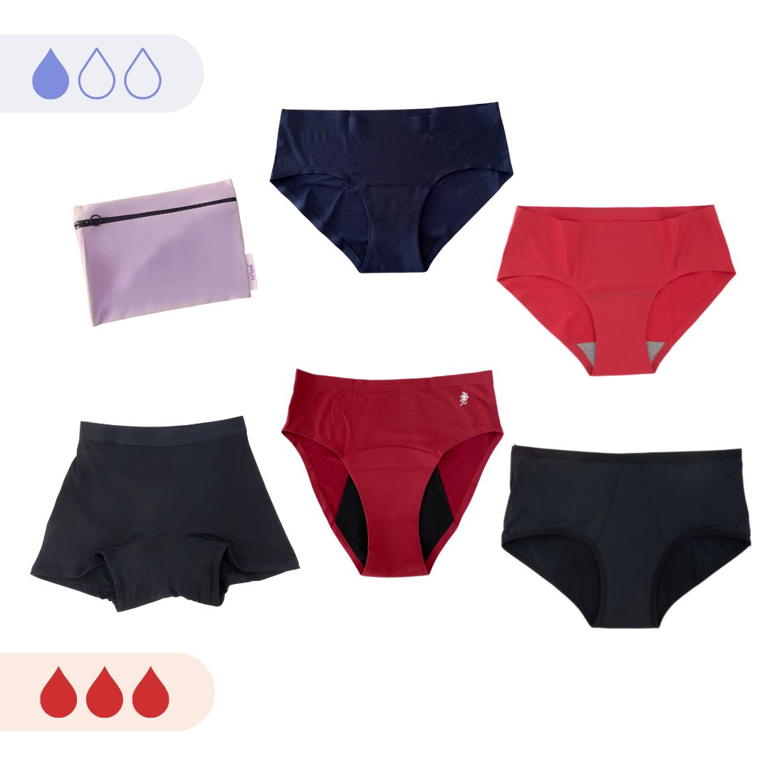 El pack ideal para iniciar un ciclo sostenible combinado diferentes absorciones dependiendo del día de tu ciclo. 2 protector panty para el uso diario + invisible abundante de color rojo de temporada + 1 bóxer abundante (el favorito) + 1 bóxer bambú para noches tranquilas + 1 bolsita transportadora para llevarlos a donde quieras. ¡Perfecto para probar diferentes calzones tal’kual!